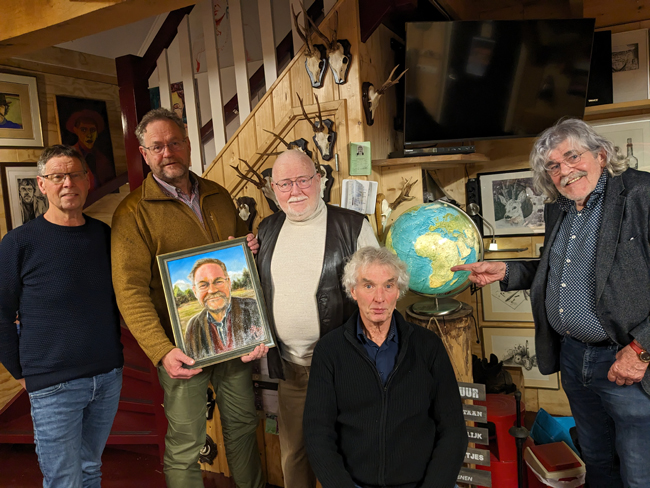 Dit portret is niet bedoeld voor een veiling, het is aan Chuck om er de juiste bestemming aan te geven. Het portret werd op verzoek van Tineke door bestuurslid Herman Letteboer overhandigd aan onze zeer gewaardeerde raadsheer. Een groepsfoto met de raadsheer (maar zonder het fotograferende bestuurslid) mocht niet ontbreken. De goede kijker zal ontdekken dat op de wereldbol het Afrikaanse Malawi wordt aangewezen.